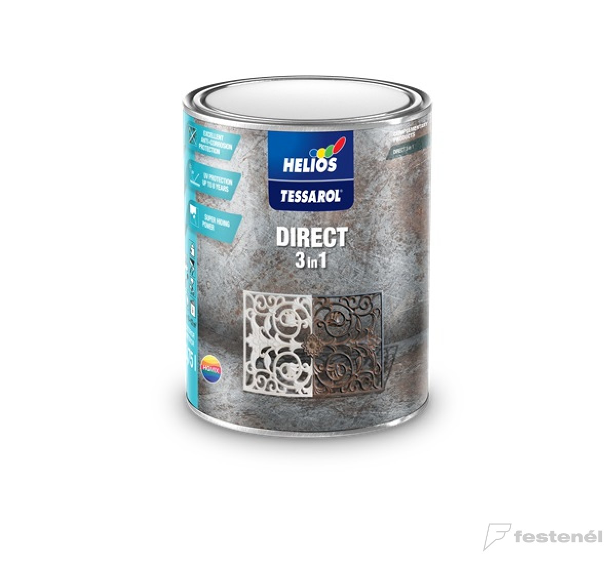 A Tessarol Direct 3in1 korróziógátló fedőbevonat vas- és acélfelületek díszítésére és védelmére. Közvetlenül a száraz, megcsiszolt, durva rozsdarészecskéktől megtisztított felületre lehet felvinni. Kiváló korróziógátló tulajdonságai miatt közvetlenül a felületre hordható fel, alapozó előzetes felvitele nélkül. Fényes fedőréteget képez a lefestett felületeken, egyúttal védve is a felületet a rozsdásodástól.